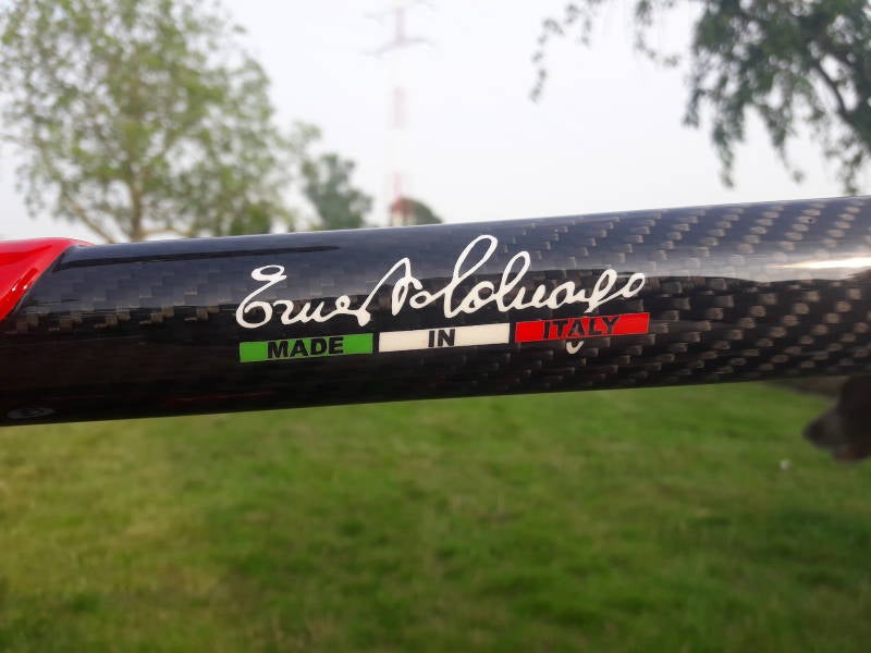 De Fiets werd opgebouwd naar wens, en uiteraard werd voor campa gekozen, en dan wel de mechanische record. Het zadel moest iets zijn waar ik al gewend aan was, dus was selle Italia flite een veilige keuze. De andere contactpunten zijn dan weer nieuw voor mij. De pedalen: look keo blade. deze geven iets meer vrijheid dan de time pedalen waar ik hiervoor mee reed. Ondertussen heeft mijn de rosa merak deze pedalen ook gemonteerd gekregen. het stuur: deda trentacinque. Mogelijk worden stuurpen en stuur nog gewisseld voor een standaard 31.7mm. Met 35mm heb je wel heel veel stuur in je handen. Wielen zijn de meer bescheiden campa zonda's. Dit met het idee om eventueel nog de shamal's van mijn de rosa merak over te zetten.