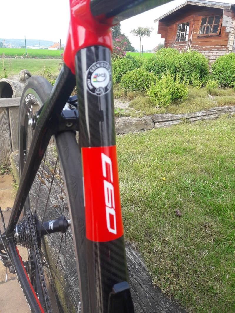 De rij-eigenschappen van de C60? Comfort boven alles. Het valt op dat de C60 bij de eerste ritje vooral aan de CLX doen denken. Hij rijd dus veel minder hard in vergelijking met de Merak. Hoewel ik niet het gevoel heb dat mijn vermogen door het frame opgeslurpt word, schiet hij toch iets minder snel uit de startblokken dan de merak. In deze conformatie is het gewicht t vergelijken met de merak. Het resultaat bergop is dan ook in lijn met de eerder vermelde punten, door het iets minder responsieve karakter moet hij het afleggen op steile pentes, maar door het comfort haalt hij zijn voordeel in langere gematigde pentes.